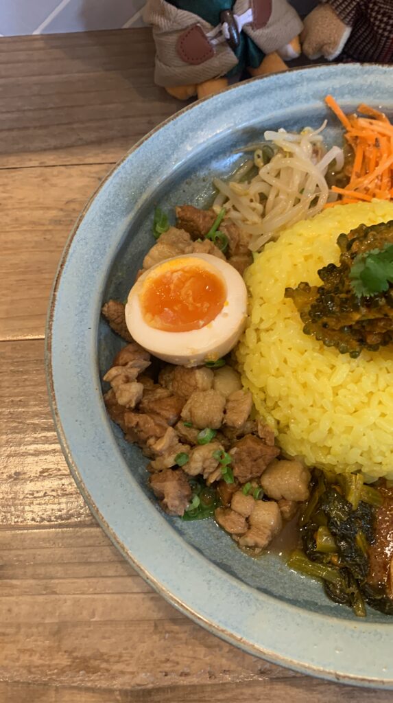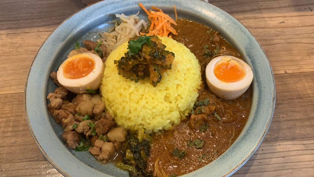 ルーローハンと定番のカルダモンチキンカレーの2種あいがけカレー ごはん大盛+スパイスたまご+ゴーヤのアチャール