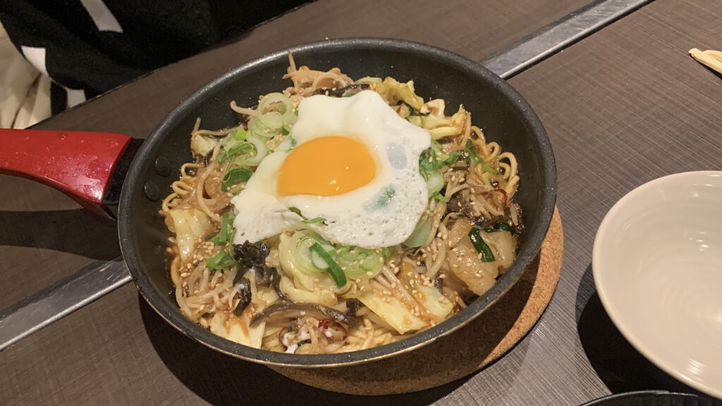 おこげ麺と甘辛たれにプリップリのホルモン。
