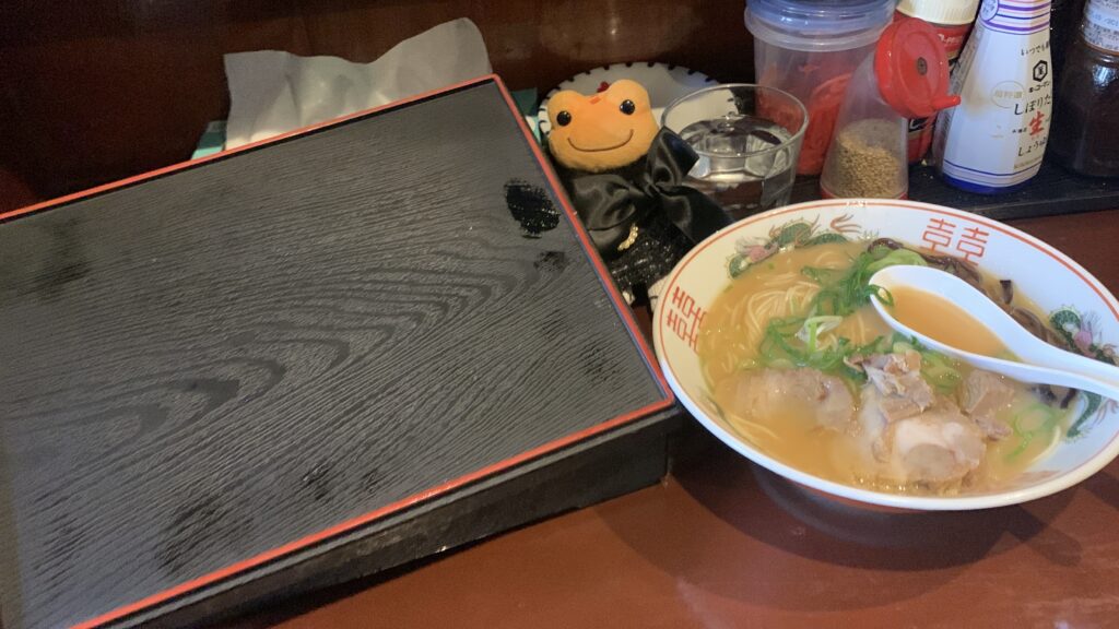 蓋の閉まらない箱の横にラーメン。満腹ラーメン定食の曼荼羅さん