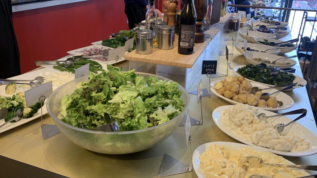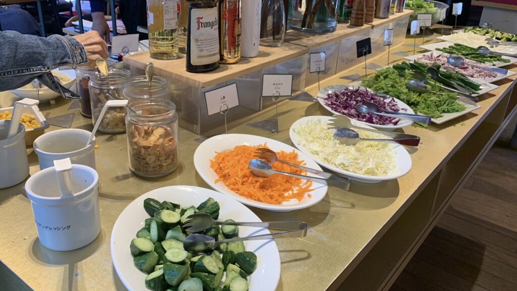 中央カウンターのビュッフェ台には、レタス・紫キャベツ・きゅうり・ブロッコリー・コーン・にんじんといった定番野菜から、