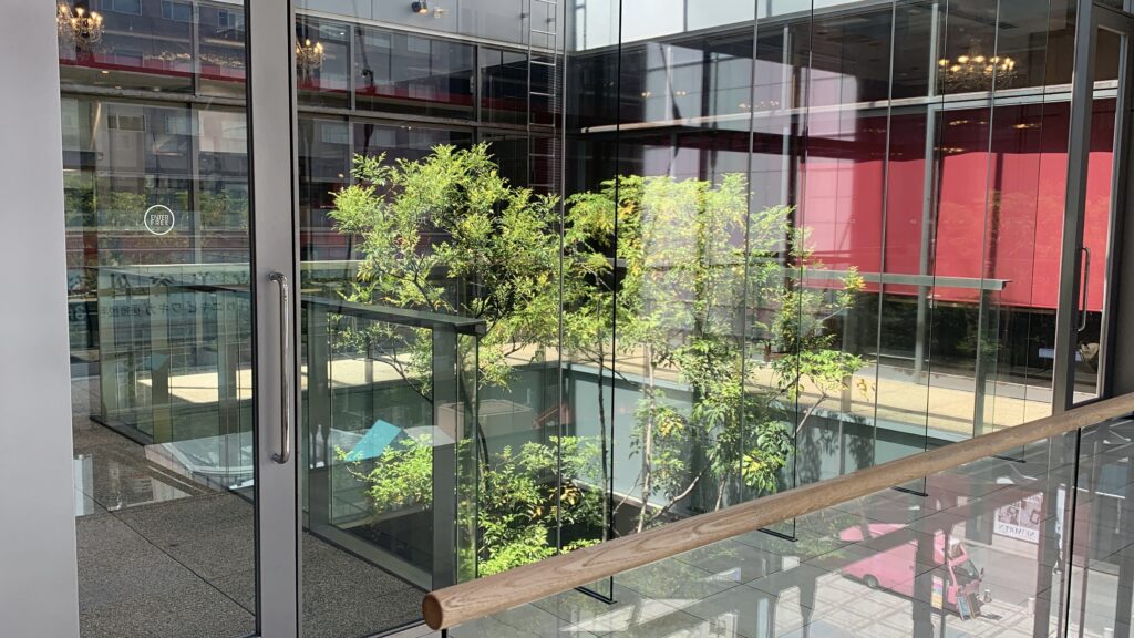開放的な4階からの眺め。窓側の席ではオシャレな中庭を見ながらゆったり食事できます。
