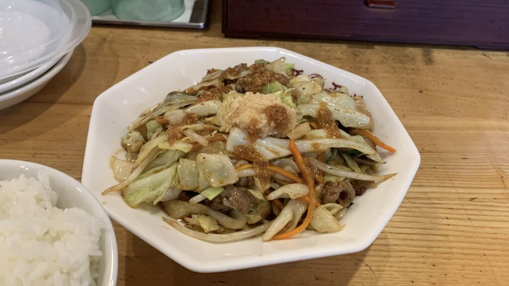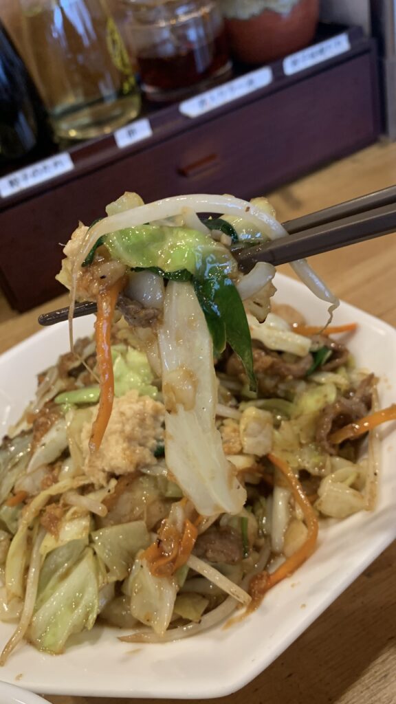 ラムと豚、そして野菜を特製醤油ダレで豪快に炒める。